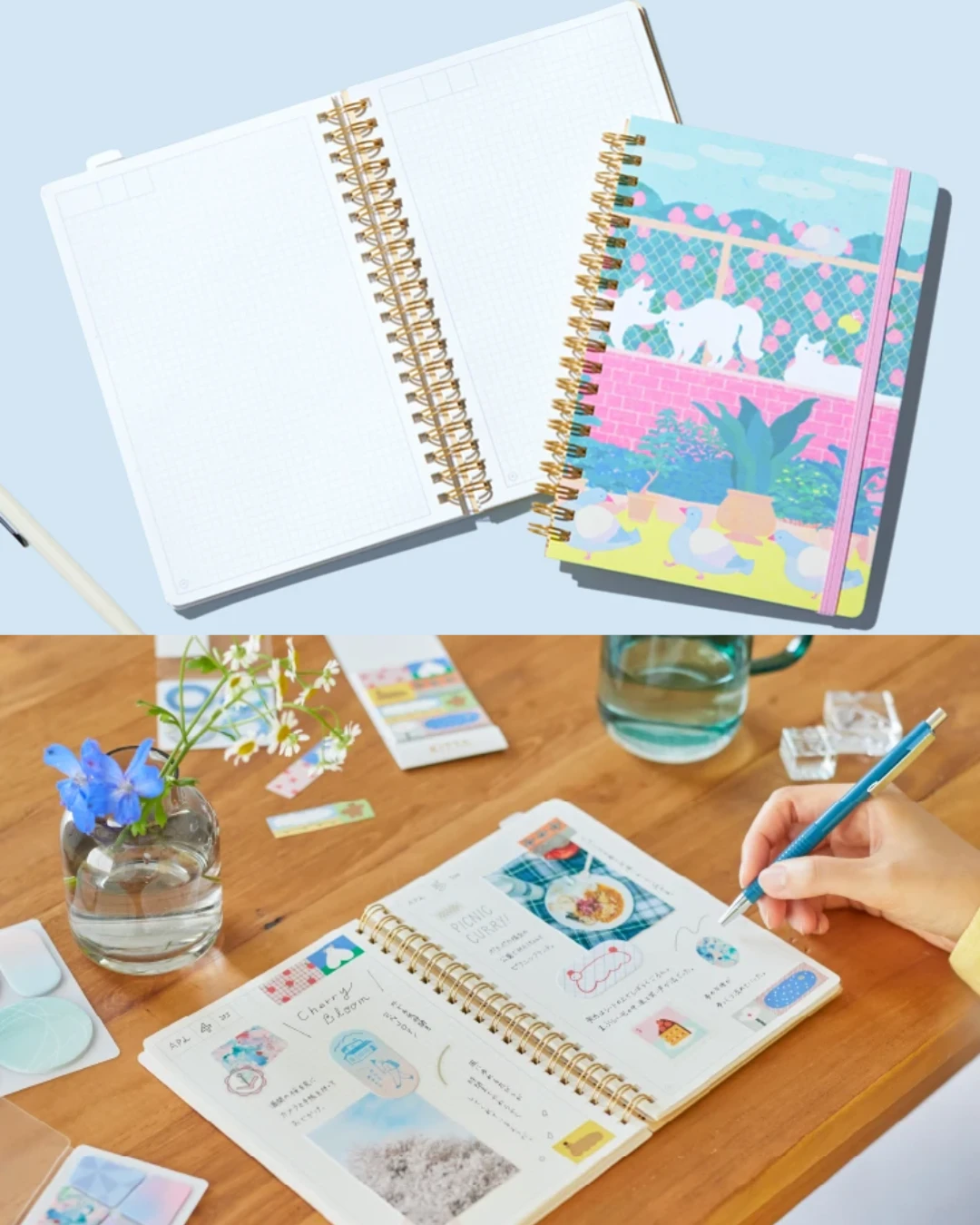 Na końcu posiada przezroczyste kieszenie na naklejki, karteczki itp. Plastikowa przekładka pełni funkcję linijki lub zakładki.
