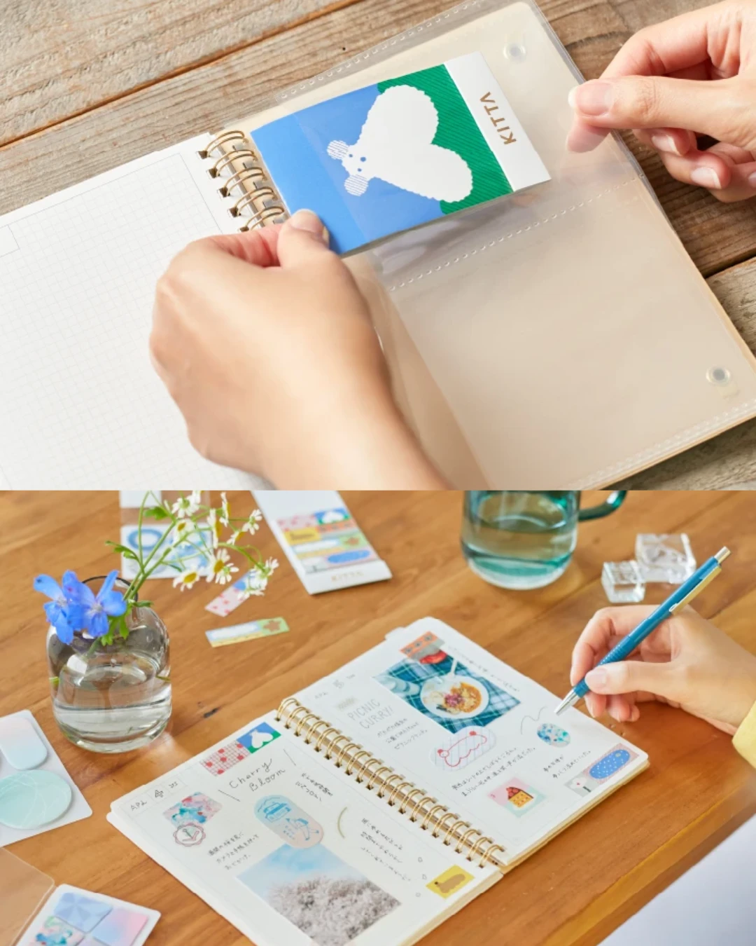 Na końcu posiada przezroczyste kieszenie na naklejki, karteczki itp. Plastikowa przekładka pełni funkcję linijki lub zakładki.